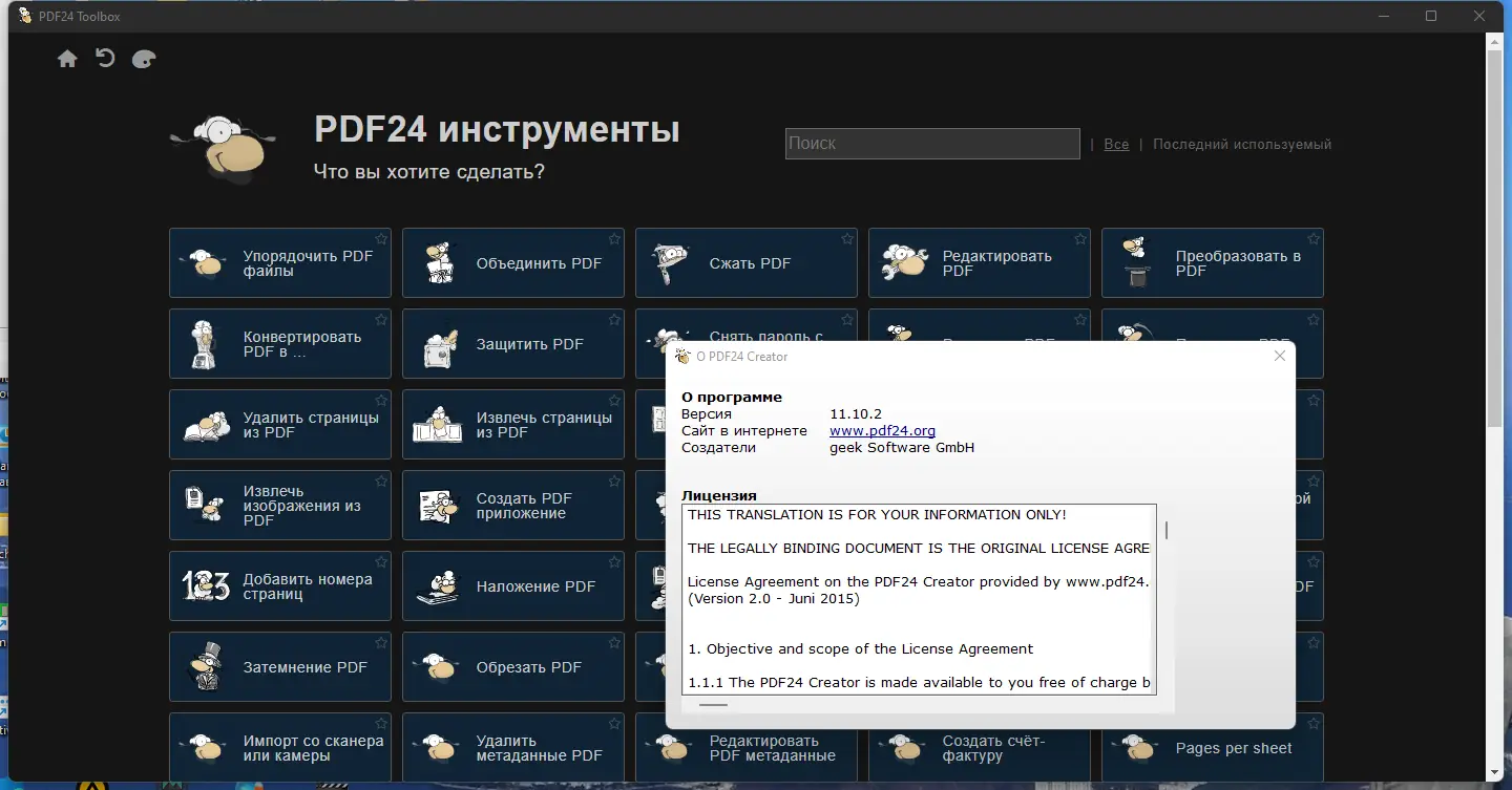 PDF24 Creator — это универсальное решение для создания, просмотра, объединения и защиты PDF-файлов. Простая установка с помощью мастера инсталляции делает программу доступной для пользователей любого уровня, а интуитивно понятный интерфейс — удобен для быстрого освоения. Программа обеспечивает расширенные функции по редактированию свойств файла, объединению нескольких документов в один, разделению на отдельные части и добавлению цифровых подписей. Также возможна защита документов паролем и их отправка по электронной почте. Встроенный просмотрщик облегчает работу с файлами, позволяя просматривать содержимое и выбирать нужные страницы перед сохранением или распространением.