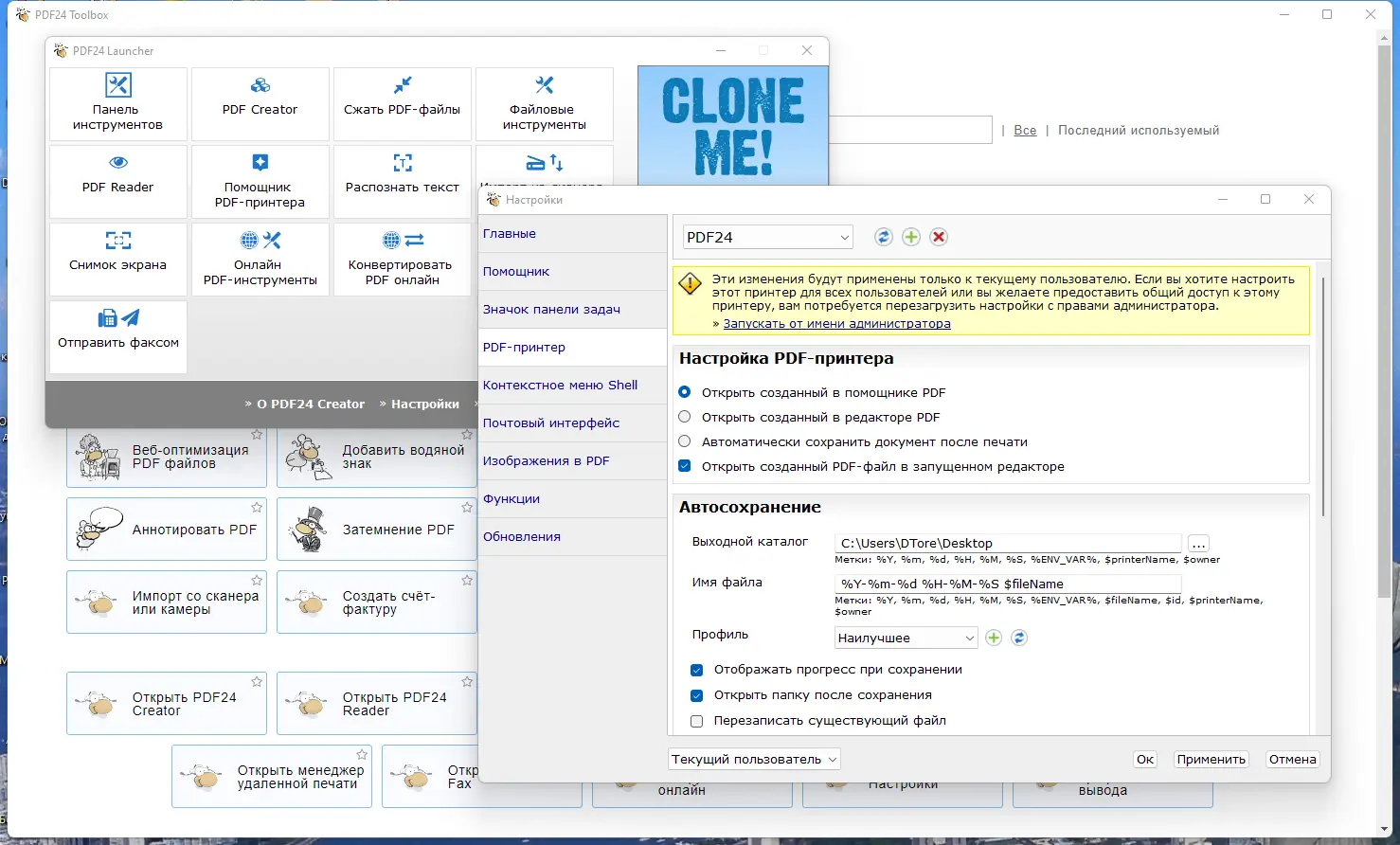 Удобство использования достигается за счёт интуитивного интерфейса и мастер-инсталлятора. Встроенные функции позволяют менять параметры качества, выбирать цветность, размеры бумаги и режимы печати. Для работы также предусмотрены режимы предварительного просмотра и редактирования документов, а возможность слияния и разделения файлов делает данный инструмент универсальным средством для работы с PDF. Кроме того, программа поддерживает создание подписи, отправку файлов по электронной почте и захват экрана для быстрого создания PDF из области экрана.