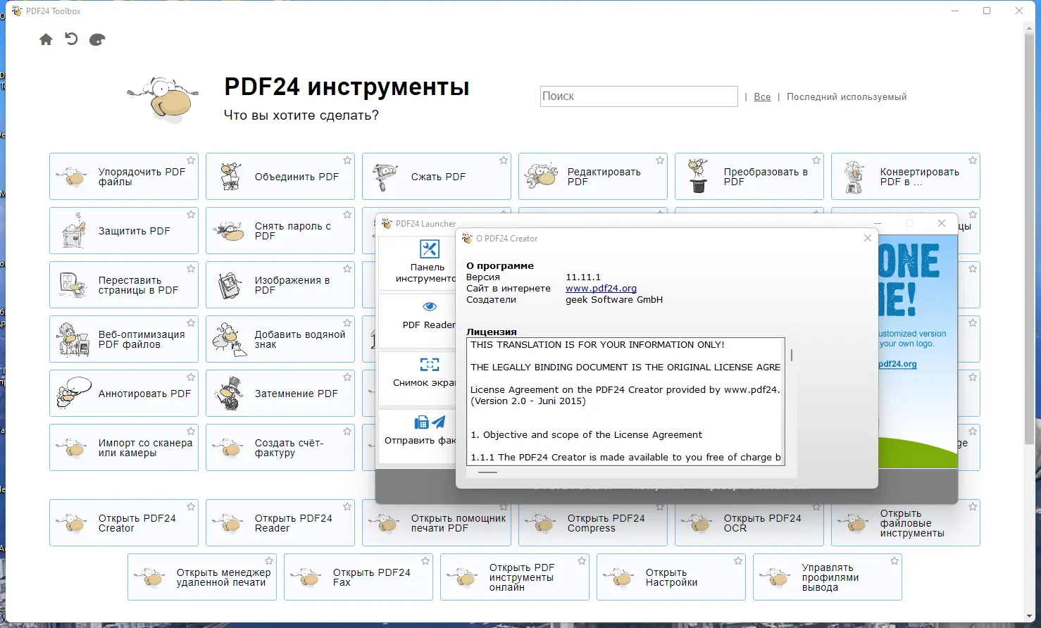 PDF24 Creator — это бесплатная программа, которая позволяет легко создавать PDF-документы практически из любого графического изображения, поддерживая форматы PNG, JPEG, BMP, PCX, TIFF, PSD. При помощи виртуального принтера пользователь может быстро преобразовать любые файлы в PDF. В дополнение к этому, программа предоставляет возможности просмотра, разделения, объединения, извлечения страниц, копирования элементов между документами, редактирования свойств файла и защиты от несанкционированного открытия или печати.
