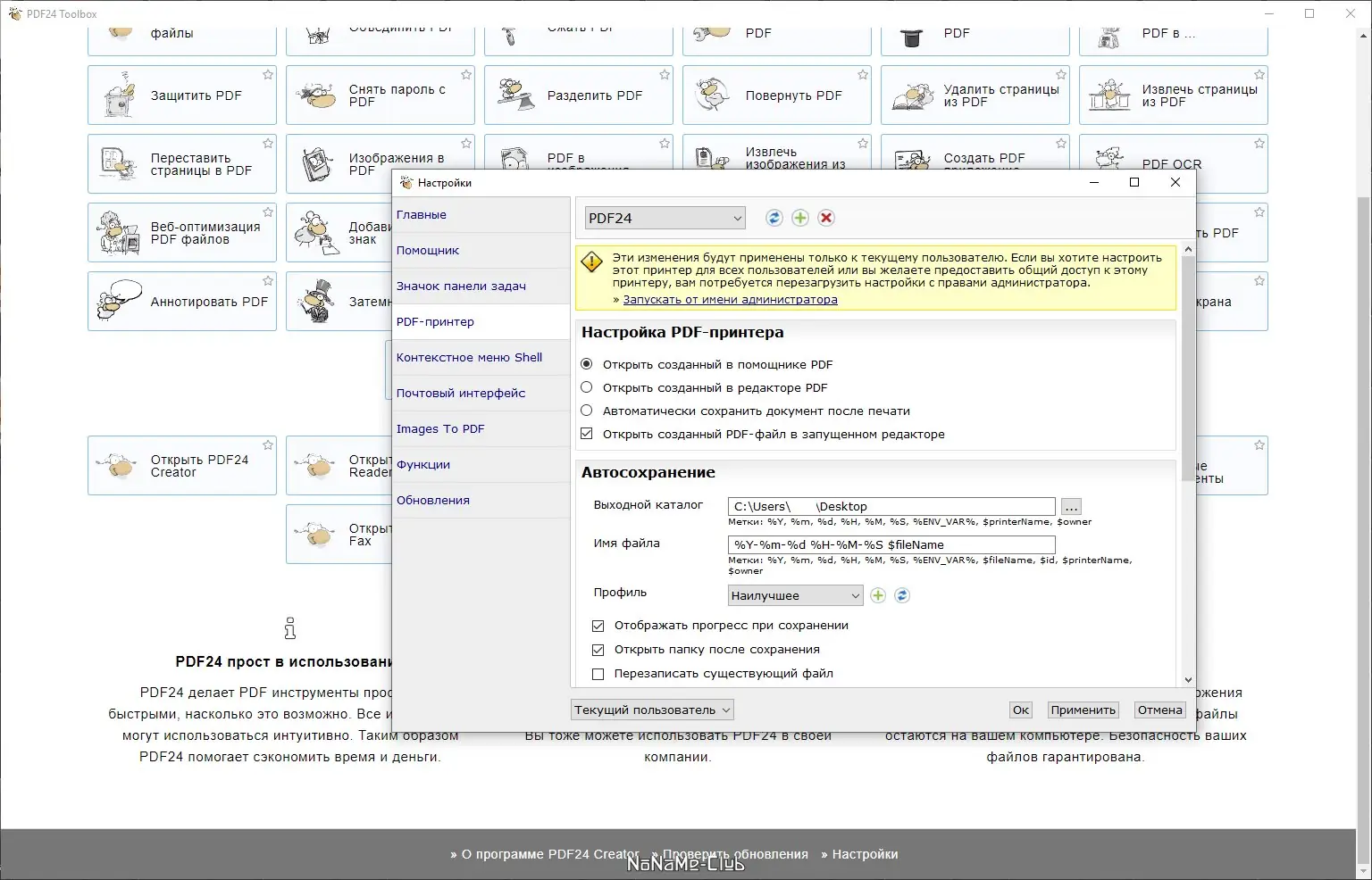Дополнительно | поддержка виртуальных принтеров, права администратора для установки |