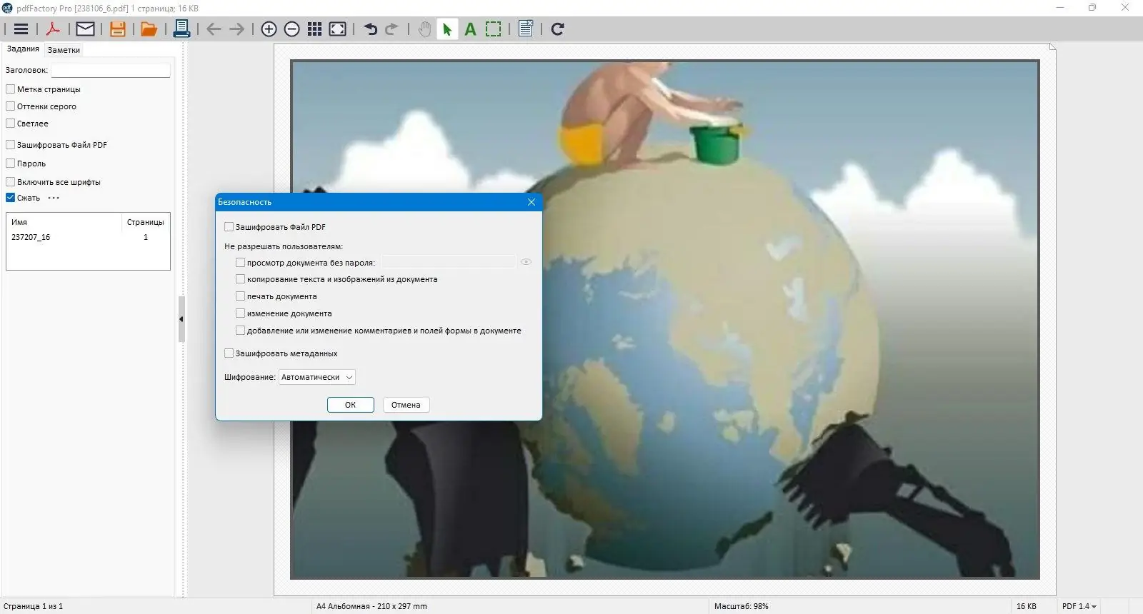 PdfFactory Pro представляет собой драйвер виртуального принтера, который трансформирует любой файл или документ в качественный PDF, поддерживая создание проектов из нескольких файлов, режим предварительного просмотра и дополнительные инструменты защиты. В базе возможна установка запрета на редактирование, шифрование и настройка пароля. Профессиональная версия расширяет функционал добавлением нумерации страниц, водяных знаков, закладок и других элементов оформления, а в последней версии реализована возможность сохранения в собственном формате FP и гибкая настройка пользовательского интерфейса. Программа легко интегрируется с любыми приложениями Windows, поддерживающими режим печати, что делает её универсальным инструментом для работы с документацией любого уровня сложности.
