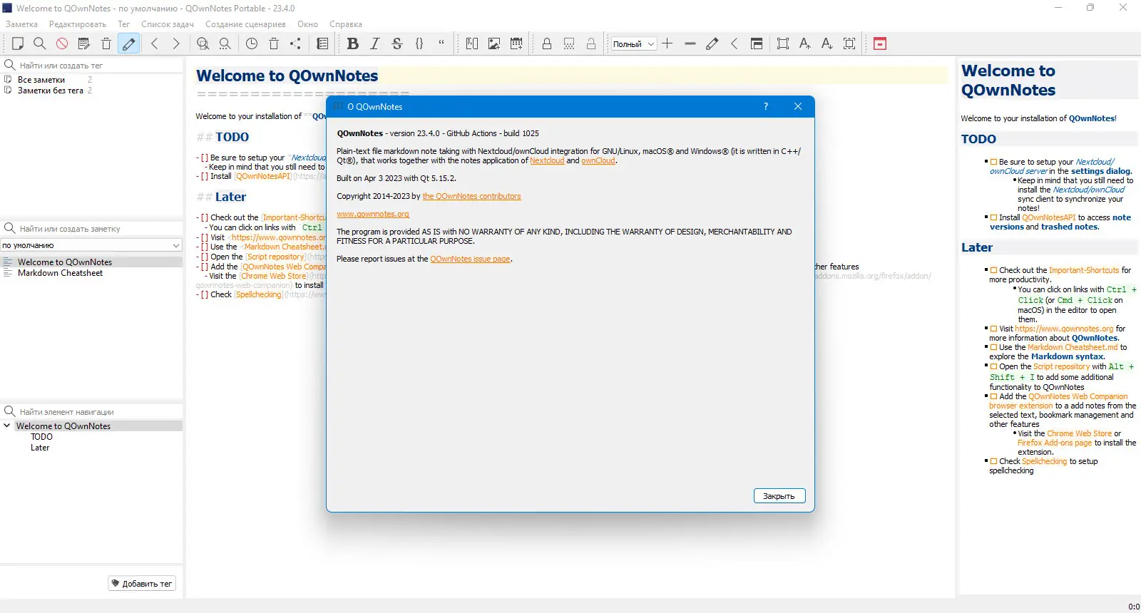 QOwnNotes — бесплатный менеджер заметок с открытым исходным кодом, который позволяет удобно структурировать и управлять различными записями, поддерживая синхронизацию с облачными хранилищами для беспрепятственного доступа с разных устройств.