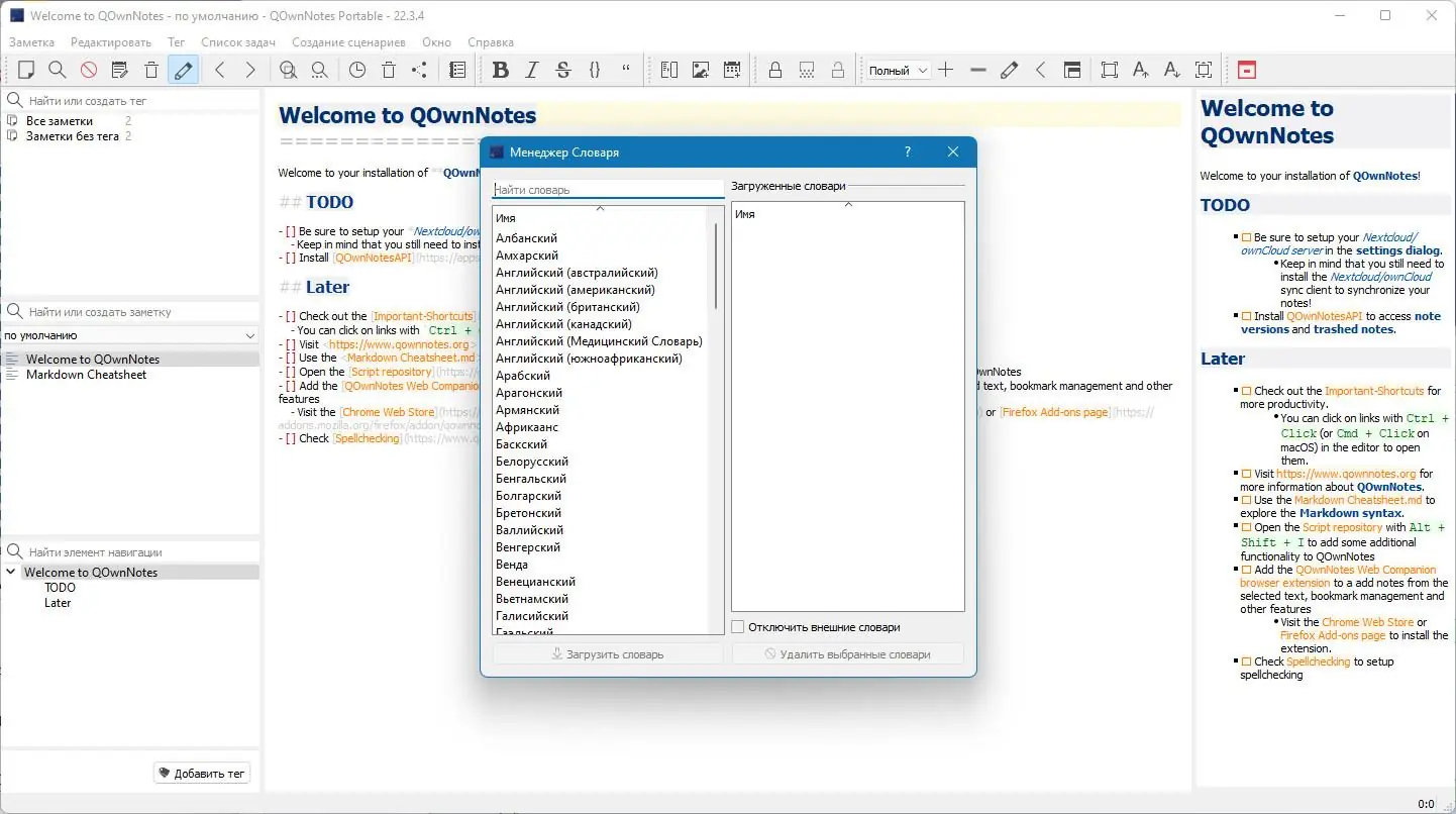 QOwnNotes предоставляет пользователю возможность систематизировать заметки в простом текстовом формате, используя форматирование Markdown для удобства и универсальности. Встроенные функции сортировки, навигации по заголовкам и поиска обеспечивают быструю работу с большими объемами информации. Программа поддерживает работу в темной теме, настройку интерфейса и поддержку тегов, включая иерархические. Дополнительные возможности включают поддержку скриптов, Vim-режима и интеграцию с сервисом Evernote. Благодаря поддержке облачных хранилищ таких как ownCloud, Nextcloud и Dropbox, заметки можно синхронизировать между несколькими устройствами, что делает работу максимально гибкой и удобной. Так как программа распространяется бесплатно и не требует установки, она идеально подходит для использования как портативное решение на системах Windows любой разрядности.