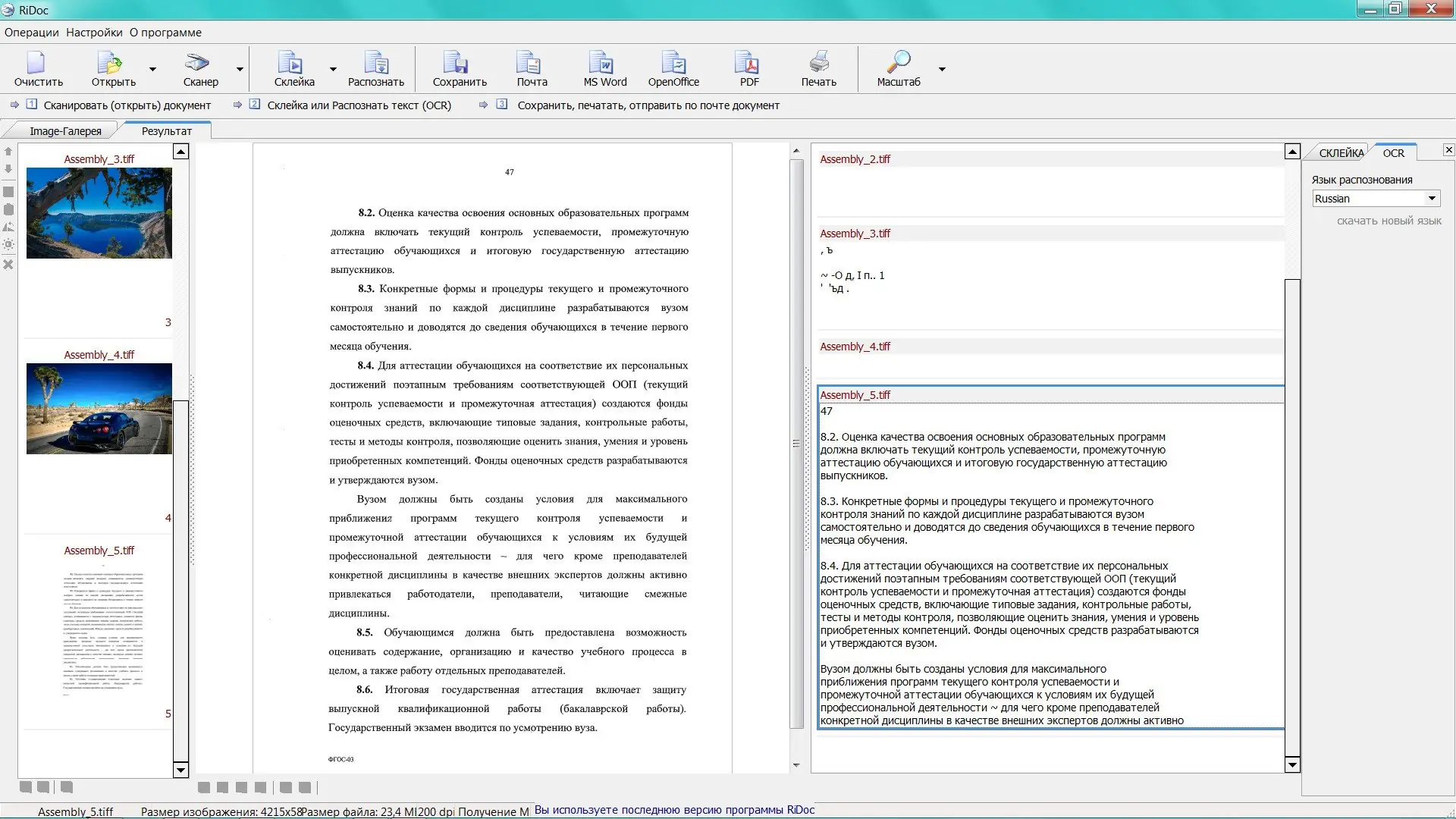 RiDoc — это удобное и простое решение для ежедневного сканирования и распознавания документов. Программа обеспечивает создание компактных электронных версий документов высокого качества, что делает её незаменимым инструментом для ведения электронных архивов, деловой переписки и цифрового документооборота. Благодаря автоматической подаче листов и поддержке различных форматов изображений, RiDoc подходит как для домашнего использования, так и для небольших офисов. Возможность сохранения в PDF, Word, TIFF и другие форматы обеспечивает максимальную гибкость работы с отсканированными данными.