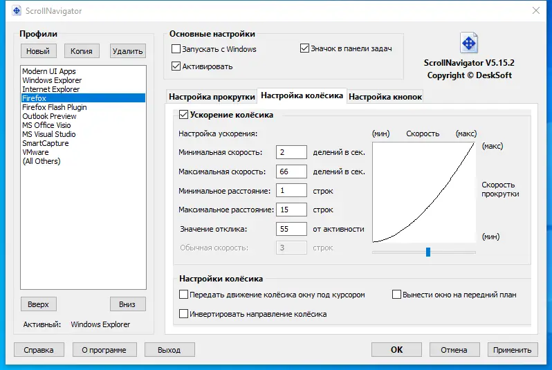 - Настраиваемое динамическое ускорение колесика мыши