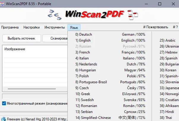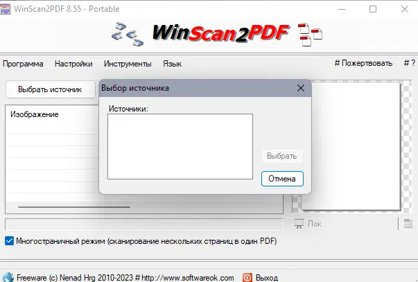 - Запустите WinScan2PDF, выберите источник и начните сканирование документов.