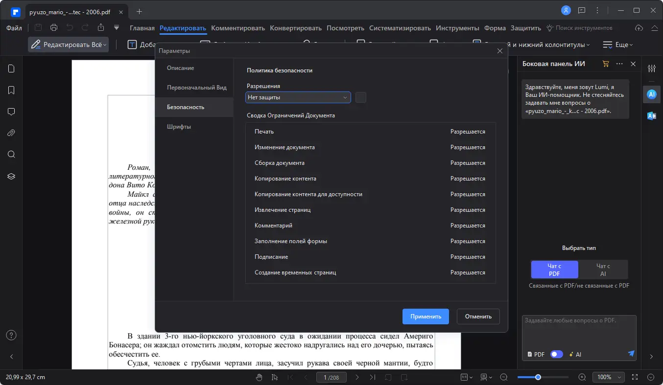 - Защита документов паролем, установка ограничений на просмотр, редактирование и печать.