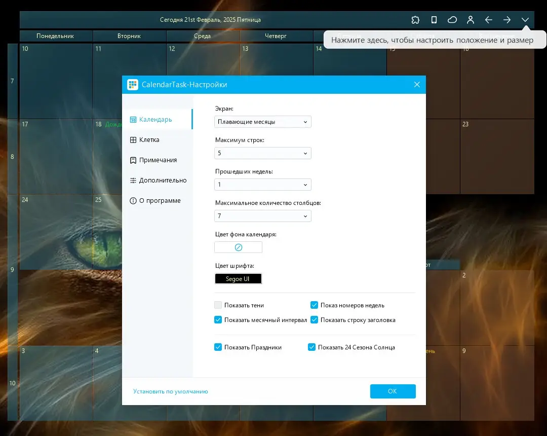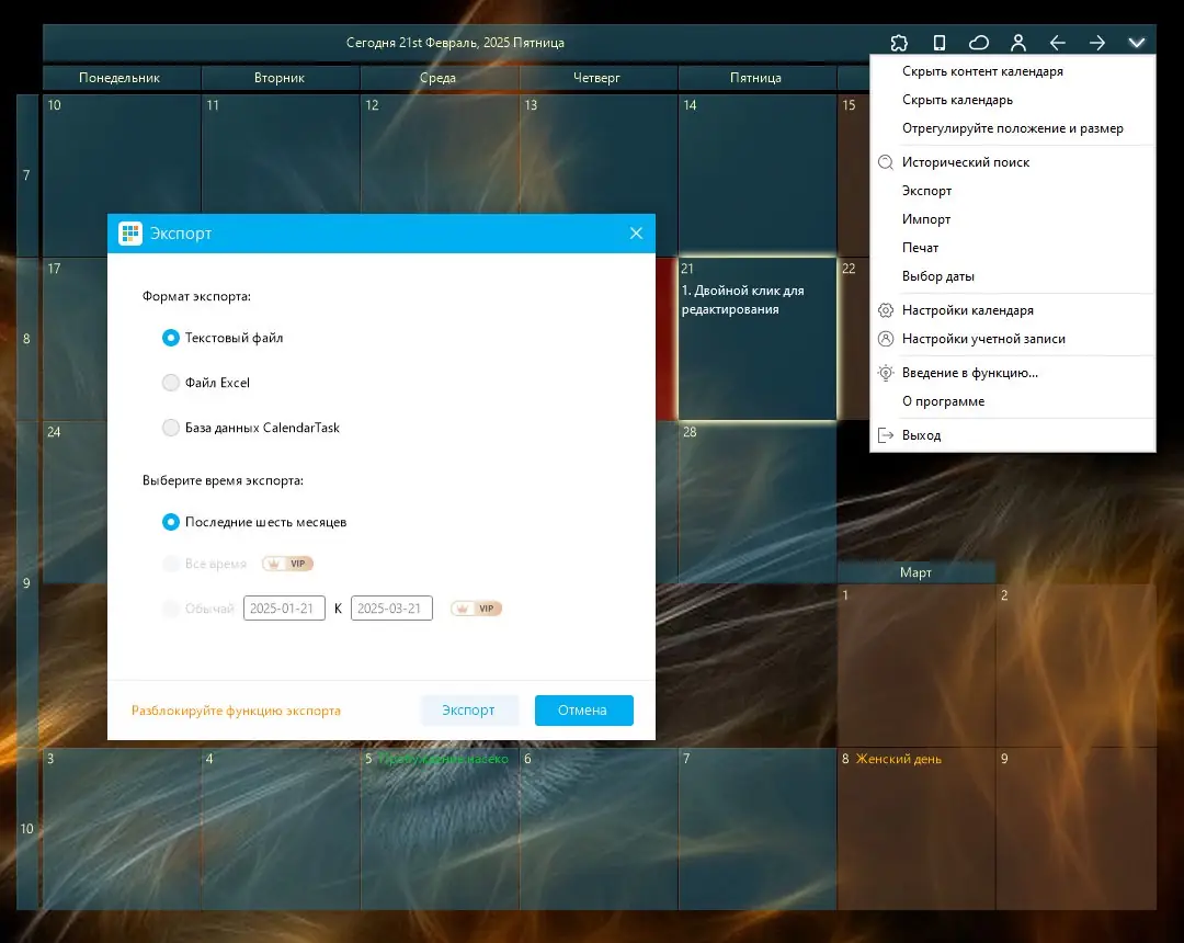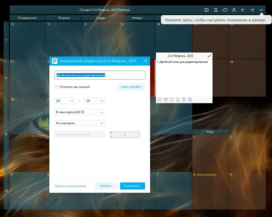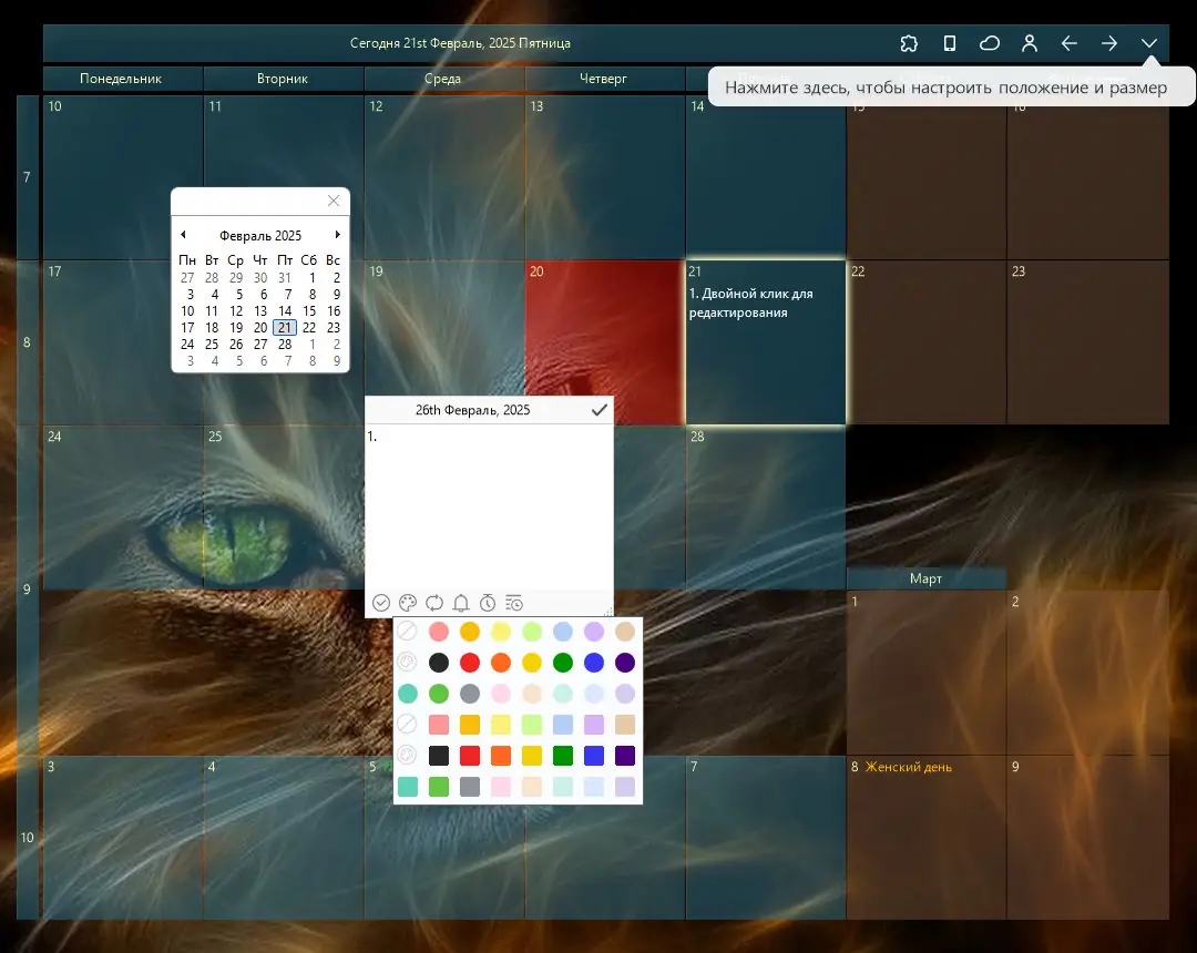 Desktop Calendar – это уникальное бесплатное решение для пользователей Windows 7, 8/8.1, 10, 11. Приложение сочетает в себе функции классического календаря и удобного органайзера, позволяя вести учет важных событий, дел и заметок прямо на рабочем столе. Интуитивно понятный графический интерфейс и широкие возможности настройки делают его полезным инструментом для активных пользователей. В отличие от стандартных решений, программа поддерживает интерфейс на русском языке и обеспечивает лёгкую интеграцию с системой, делая управление максимально комфортным. Возможность импорта и экспорта данных, а также вывод календаря на печать значительно расширяют функциональность и позволяют сохранить важную информацию или перенести её на другие устройства.
