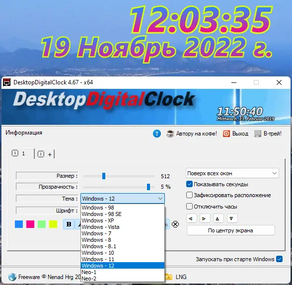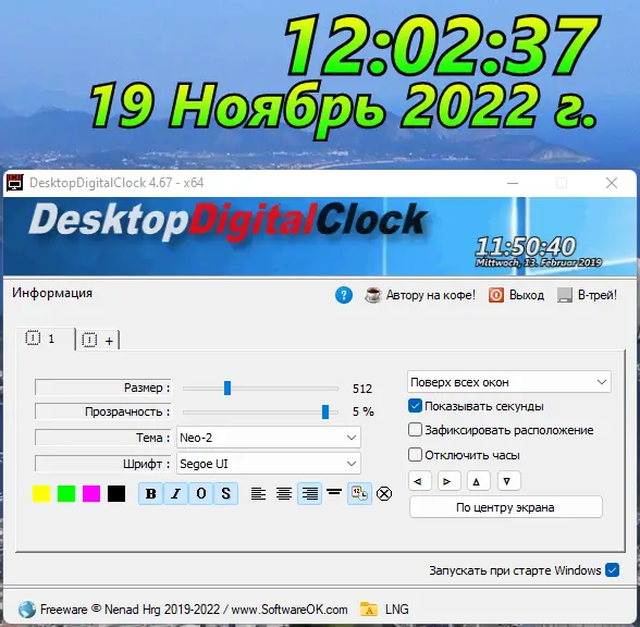 DesktopDigitalClock — это простое и эстетичное цифровое часы для рабочего стола, предоставляющее пользователю широкий выбор тем оформления и настроек отображения. Приложение обладает возможностью полностью настраивать положение, прозрачность, шрифт и цвет часов для создания индивидуального стиля без лишних усилий. Являясь портативным решением, оно не требует установки и экономит системные ресурсы, что делает его идеальным инструментом для тех, кто ценит функциональность и удобство.