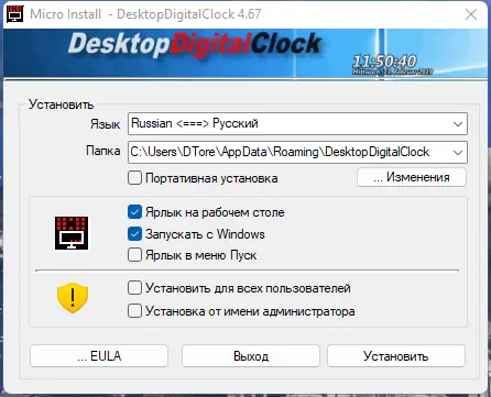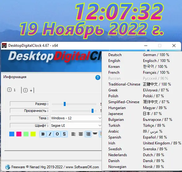 Данное приложение является удобным инструментом для отображения времени на рабочем столе с возможностью полного индивидуального оформления. Оно также отличается низким потреблением ресурсов и отсутствием необходимости в инсталляции, что делает его максимально легким в использовании.