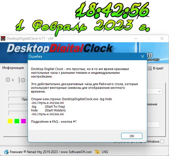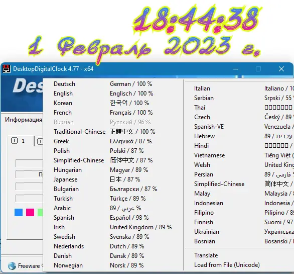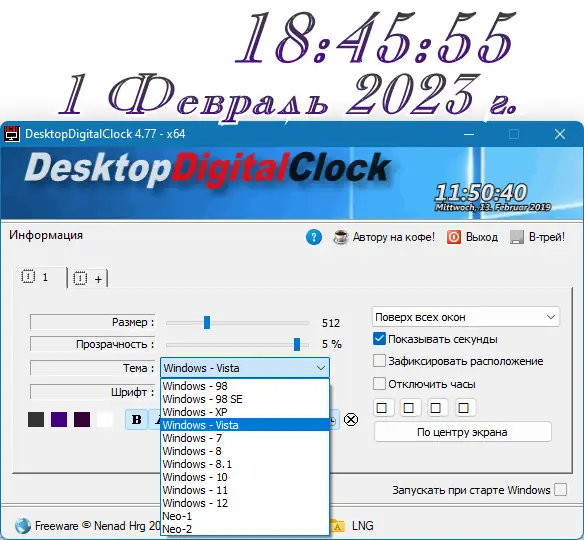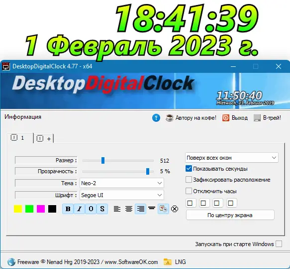 DesktopDigitalClock представляет собой легкое приложение, не требующее установки и использующее минимум системных ресурсов. Оно позволяет пользователям создавать стильные цифровые часы на рабочем столе с возможностью выбора различных тем оформления и ручной настройки визуальных параметров. Интуитивно понятный интерфейс обеспечивает гибкое управление расположением, прозрачностью, шрифтом и размером часов, а также наличие фиксированной позиции и дополнительных элементов, таких как секундная стрелка. Программа поддерживает многоязычный интерфейс и совместима с различными версиями Windows 7, 8/8.1, 10 и 11 как в 32, так и в 64 битных версиях.