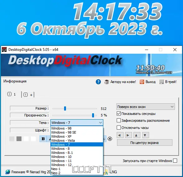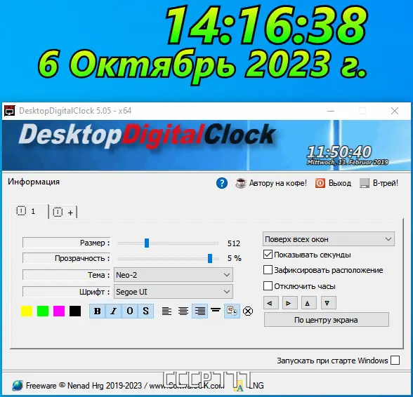DesktopDigitalClock представляет собой легкое и портативное приложение, не требующее установки. Оно практически не использует системные ресурсы и совместимо с операционными системами Windows 7, 8/8.1, 10 и 11 на архитектурах x32 и x64 бит. Пользователи могут самостоятельно выбрать внешний вид часов, изменить их положение на экране, настроить прозрачность, шрифт и размер. Возможна фиксация часов в центре экрана или свободное перемещение по рабочему столу, что делает отображение максимально удобным. Программа подойдет как для домашнего использования, так и для профессиональной среды, где важно иметь точную и красивую индикацию времени.