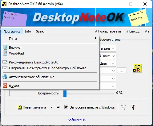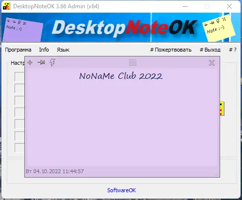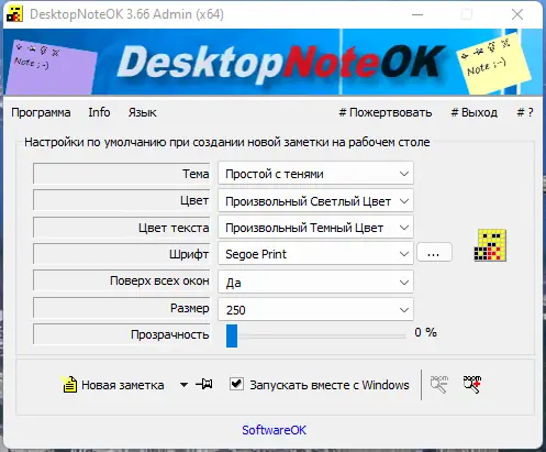 DesktopNoteOK — это простая и портативная программа для создания небольших текстовых заметок на рабочем столе, позволяющая всегда держать важную информацию под рукой. Инструмент идеально подходит для быстрого записывания идей, напоминаний или планов, не отвлекаясь на сложные интерфейсы и настройки.