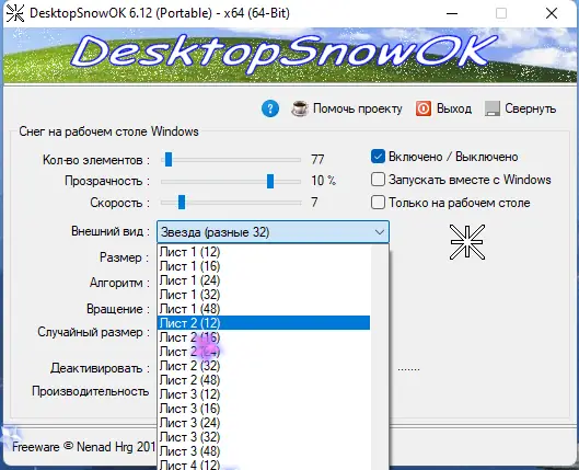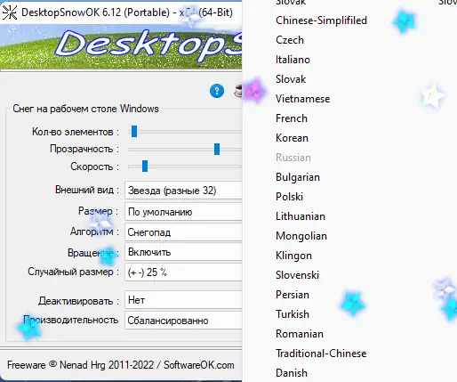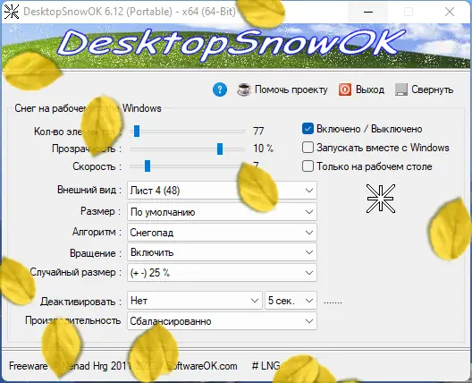 DesktopSnowOK — небольшая программа, которая украшает рабочий стол падающими снежинками, создавая эффект зимней сказки. Она обладает удобным интерфейсом на русском языке и поддерживает различные виды снежинок, включая звездочки, шарики и даже текстуры в виде прозрачных футбольных мячей. Настройка прозрачности, скорости падения и количества снежинок осуществляется легко и интуитивно. Благодаря портативной версии ее можно запускать без установки на любой совместимой системе.