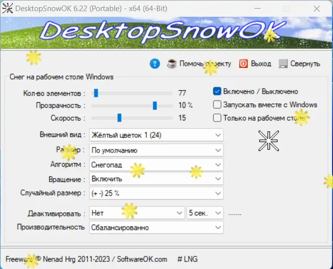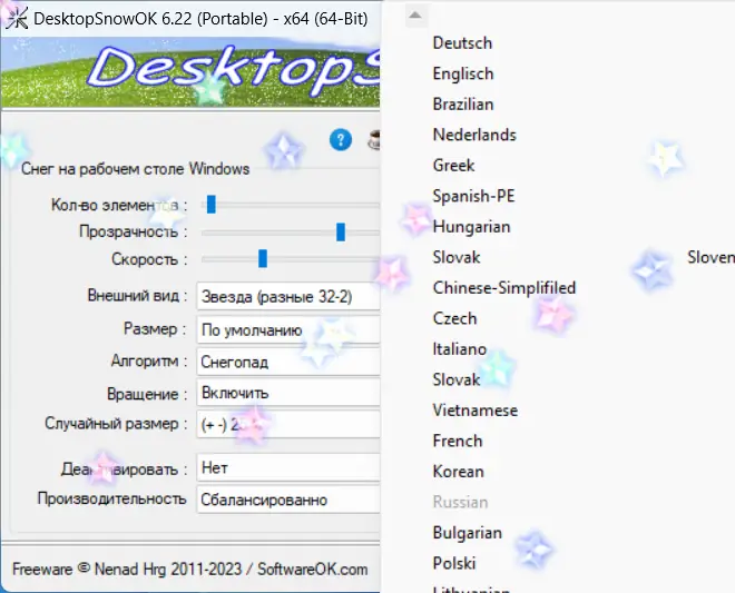 DesktopSnowOK — это легкая и настраиваемая программа, которая украшает ваш рабочий стол эффектом падающих снежинок, создавая атмосферу зимней сказки. Не требуя установки и не мешая работе, она идеально подходит для любителей спокойных и красивых визуальных дополнений. Программа поддерживает русский интерфейс и предлагает широкий выбор видов снежинок — от классических шариков до звездочек и прозрачных текстур, похожих на футбольные мячи. Благодаря простоте настройки и возможности изменения количества снежинок, прозрачности и скорости падения, пользователь получает полный контроль над визуальным оформлением.