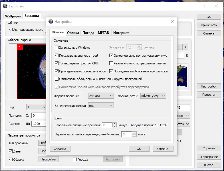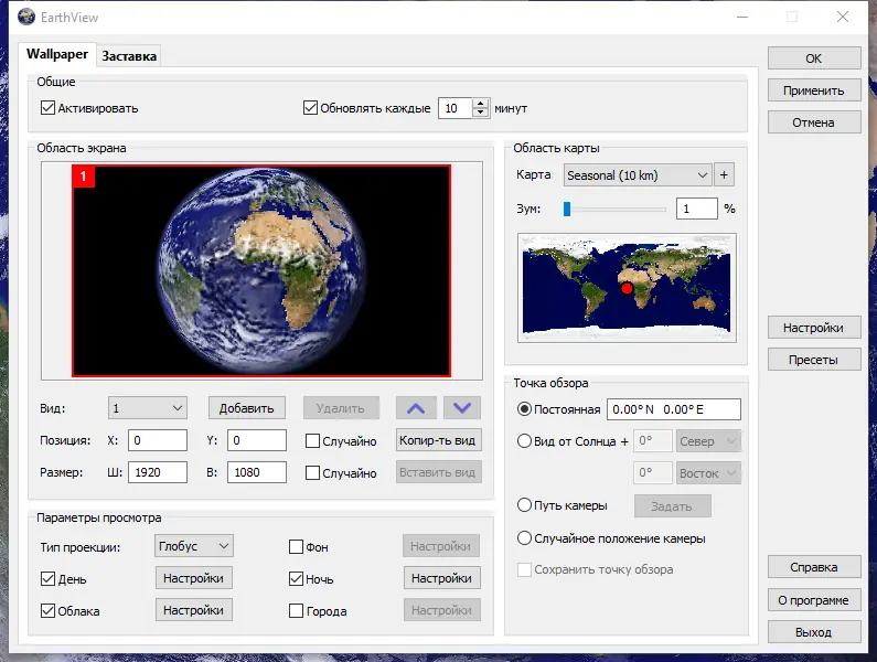 EarthView — это мощная программа для создания динамических обоев и экранных заставок с впечатляющими видами Земли, которые отображают как дневной свет, так и ночные тени, а также разнообразные атмосферные эффекты и карты планеты.