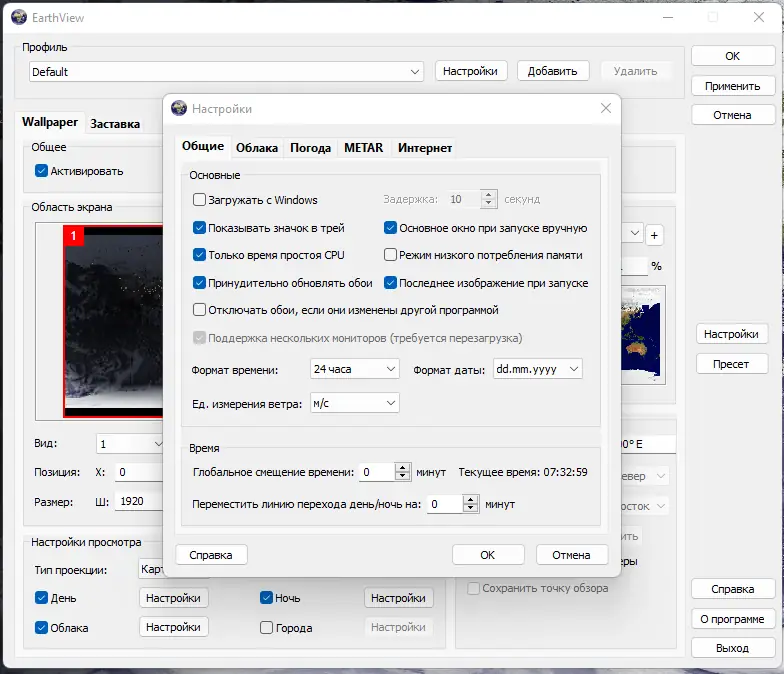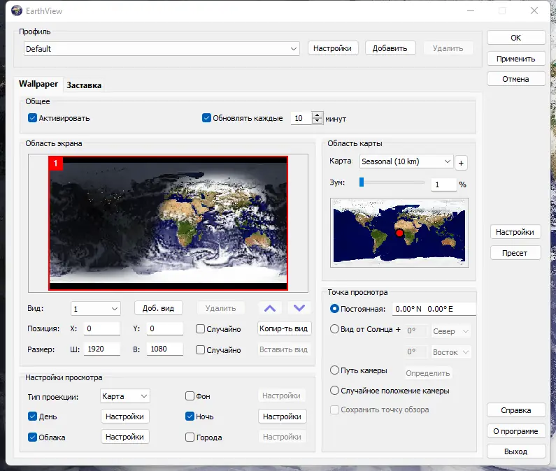 EarthView — это многофункциональное приложение для Windows 7, 8/8.1, 10 и 11, поддерживающее 32 и 64 бита. Оно позволяет отображать высококачественные живые изображения планеты, включая виды карты и глобуса, городские районы, огни мегаполисов и атмосферные детали. В программе реализована возможность демонстрации сезонных изменений, облачности, погодных данных и местного времени более чем в 140 000 городах по всему миру. EarthView подходит как для установки в виде обычных обоев, так и для использования в качестве экрана заставки, обладая расширенными настройками для каждого монитора. Программа бесплатно распространяется, а также имеется возможность установки через торрент для быстрого скачивания. При покупке полная версия предоставляет доступ к более детализированным картам и высоким разрешениям изображений, превышающим 3840×2160 пикселей.