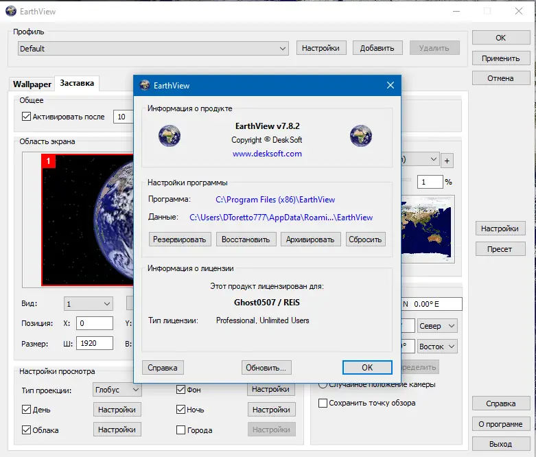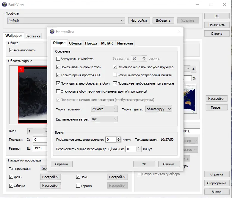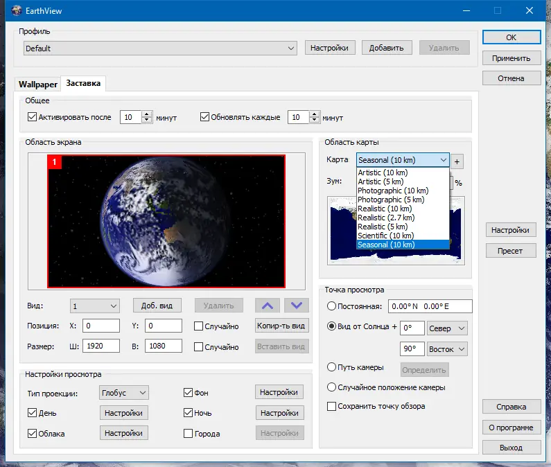 EarthView — это мощная программа для создания динамических обоев и экранных заставок с высококачественными изображениями Земли в разных режимах отображения и с обширными возможностями настройки.