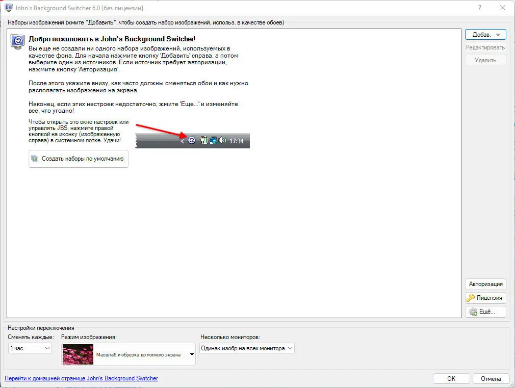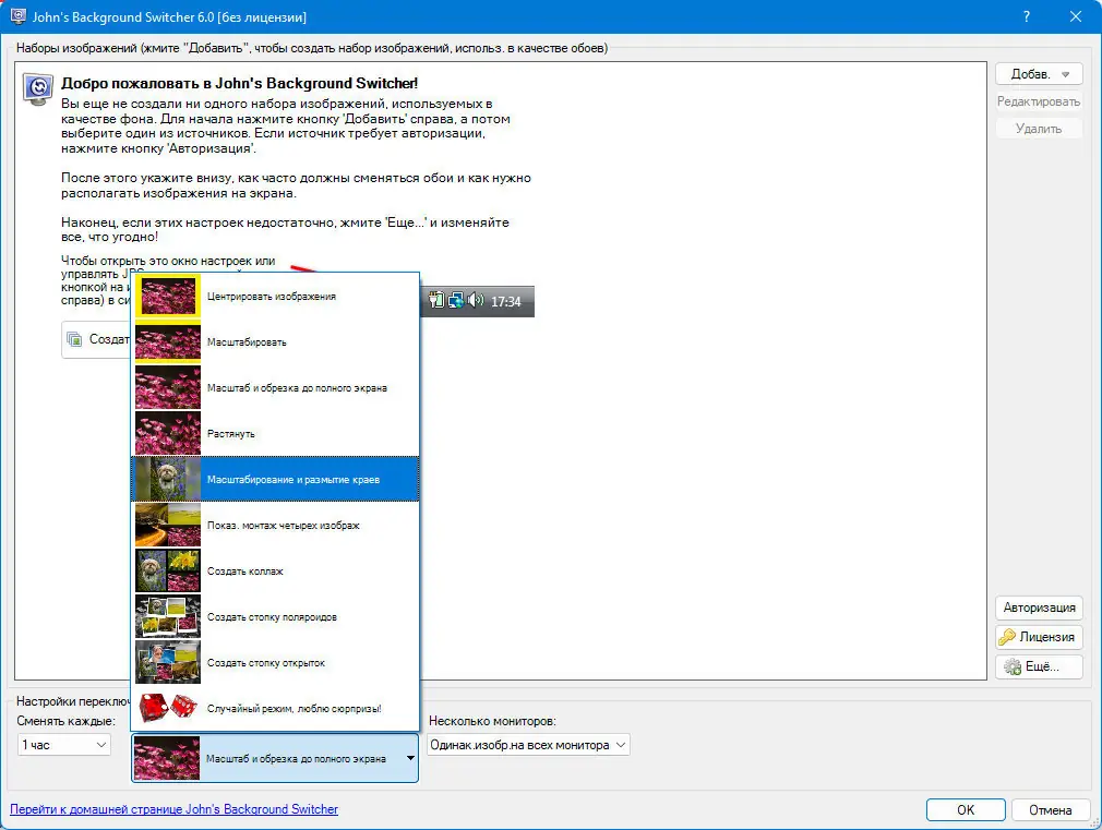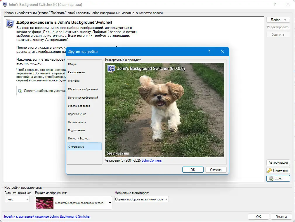 - Настройте источники изображений и параметры смены фонов через основные диалоги программы или через дополнительное окно настроек.