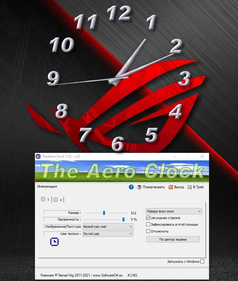Программа представляет собой декоративные настольные часы с полной прозрачностью, которые показывают местное время прямо на вашем рабочем столе. Благодаря удобным настройкам, вы можете регулировать размер, фактуру и положение часов, создавая идеально подходящий интерфейс. Основным преимуществом является уникальный дизайн и возможность полного контроля над внешним видом часов, что делает их не только функциональным, но и стильным элементом рабочего пространства.