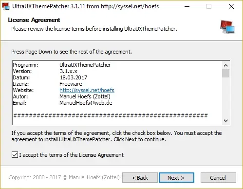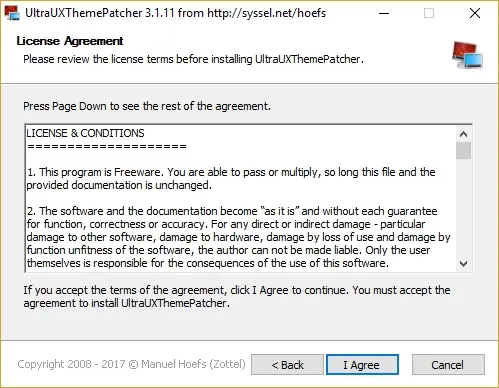 - Запустите UltraUXThemePatcher и выполните установку, следуя подсказкам мастера.