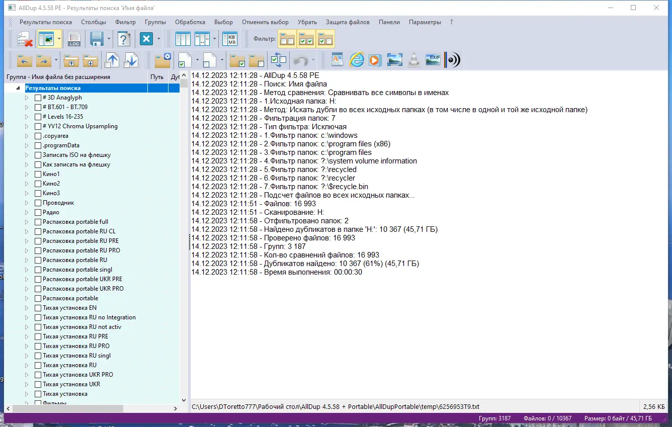 AllDup — это бесплатный инструмент для поиска и удаления дубликатов файлов на вашем компьютере. Благодаря специально разработанному алгоритму программа быстро находит копии любых типов файлов — текстовых документов, изображений, музыки, фильмов и других. Вы можете задать для анализа определённые диски или папки, а мощная система поиска за считанные секунды обработает гигабайты информации, находя дубли по различным критериям, таким как имя файла, расширение, размер, содержимое, дата изменения или создания, атрибуты файла и его расположение. После обнаружения дубликатов, пользователь может просмотреть их и принять решение о удалении, копировании или перемещении. Программа помогает навести порядок в файловой системе, освободить место и избавиться от ненужных копий, делая работу с файлами проще и эффективнее.