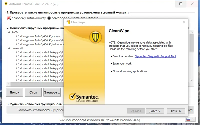 Antivirus Removal Tool — это портативный набор официальных утилит, предназначенный для удаления различных антивирусных программ с компьютера. Программа обеспечивает автоматическую идентификацию установленного антивируса и предлагает простое управление процессом его деинсталляции с помощью удобной графической оболочки. Отличительной особенностью продукта является возможность поиска остатков удалённых антивирусов в системе и их дальнейшая очистка с использованием официальных утилит деинсталляции. Это делает инструмент особенно ценным для системных администраторов и пользователей, стремящихся быстро и безопасно избавиться от нежелательного программного обеспечения.