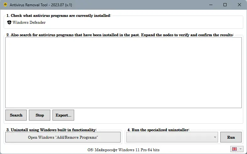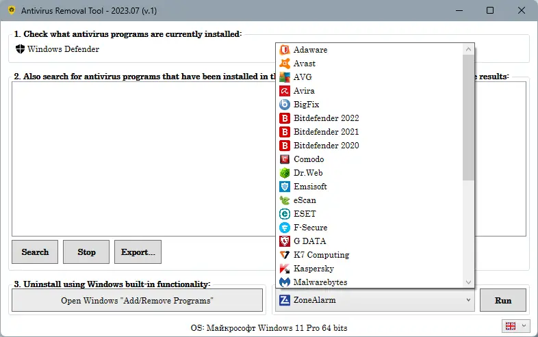 Antivirus Removal Tool — портативный набор официальных утилит для быстрого и безопасного удаления антивирусных программ с системы. Этот инструмент включает удобную графическую оболочку, которая автоматически определяет установленный антивирус и предлагает запустить соответствующую утилиту деинсталляции, обеспечивая чистое удаление без остаточных файлов и следов. Благодаря наличию встроенного поиска следов удалённых антивирусов, можно выполнить дополнительные меры очистки системы, повысив её безопасность и стабильность.