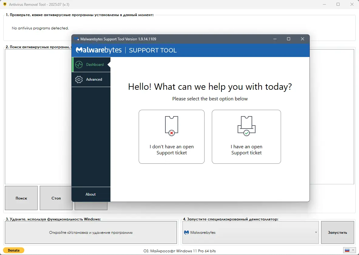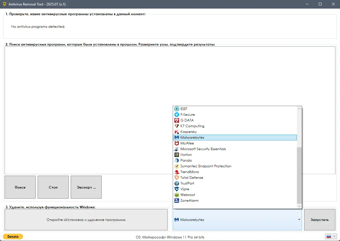 Antivirus Removal Tool — это портативный набор официальных утилит, предназначенных для полного удаления антивирусных программ с системы. Этот сборник включает удобную графическую оболочку, которая автоматически определяет установленный антивирус и предлагает запустить соответствующую утилиту удаления. Инструмент позволяет выбрать нужную программу для деинсталляции или просканировать систему на наличие остатков удалённых антивирусов, обеспечивая максимально чистую очистку системы.
