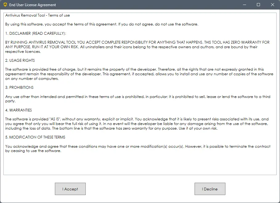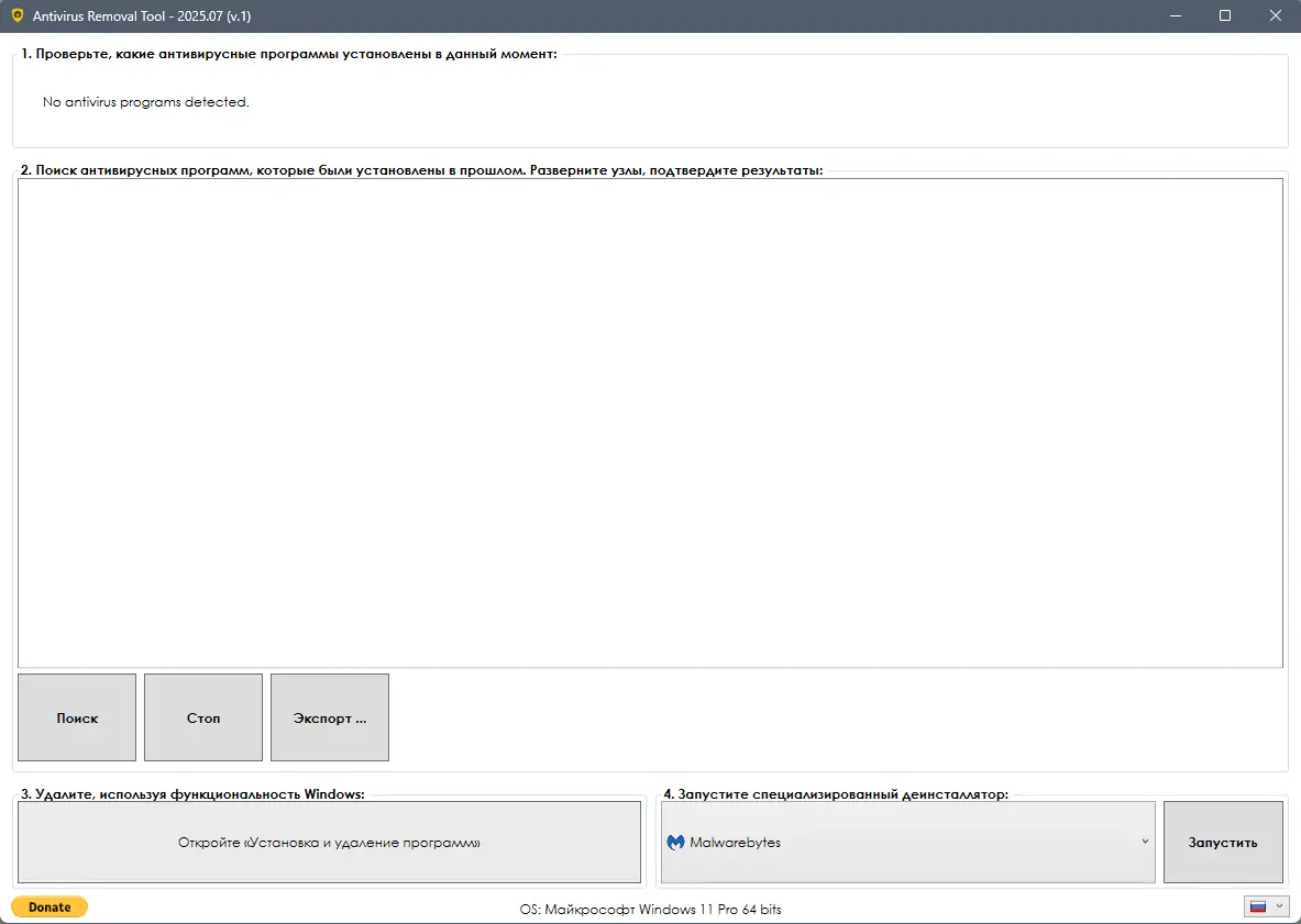 Antivirus Removal Tool был создан как универсальное решение для быстрого и безопасного удаления различных антивирусных продуктов. В состав сборника входят официальные утилиты для удаления 28 популярных антивирусов, включая такие как Kaspersky, Avast, Norton, McAfee и другие. Графическая оболочка облегчает процесс, автоматически определяя установленное программное обеспечение и предлагая подходящие инструменты для его удаления. Также программа позволяет провести поиск остатков антивирусных следов в системе и выполнить их удаление, что особенно важно при необходимости полностью избавиться от следов удалённых программ.