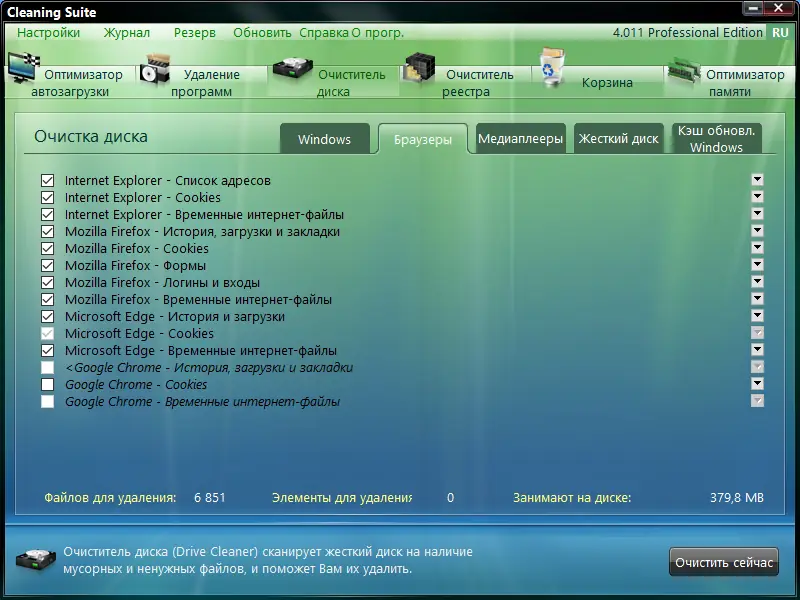 - Быстрая очистка временных файлов и истории браузеров