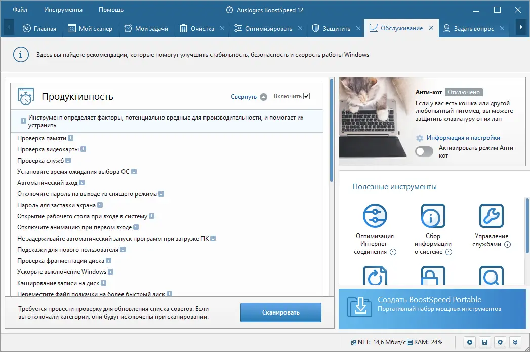 Auslogics BoostSpeed – это популярный набор инструментов для улучшения работы вашего компьютера под управление Windows. Он позволяет значительно оптимизировать систему, настраивать параметры Windows, очищать жесткий диск и системный реестр от мусора, а также выполнять дефрагментацию дисков и реестра. Благодаря удобному интерфейсу и автоматическим советам программа помогает даже неопытным пользователям быстро повысить производительность ПК, оптимизировать скорость интернет-соединения и устранить множество ошибок. В состав входит ряд дополнительных утилит для восстановления данных, поиска ошибок и управления системой, что делает её универсальным средством для поддержания ПК в отличном состоянии.