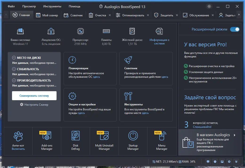 Auslogics BoostSpeed — это популярная программа, предназначенная для комплексной настройки и оптимизации компьютера под управлением Windows. Она помогает значительно повысить производительность системы, очистить жесткий диск и системный реестр от ненужных файлов и записей, выполнить дефрагментацию дисков и реестра, а также улучшить скорость интернет-соединения и решить множество других задач по обслуживанию ПК.