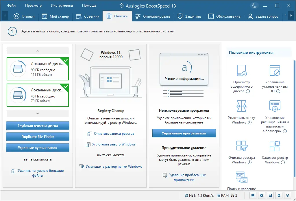 - Очистка дисков от временных и ненужных файлов для повышения скорости системы.