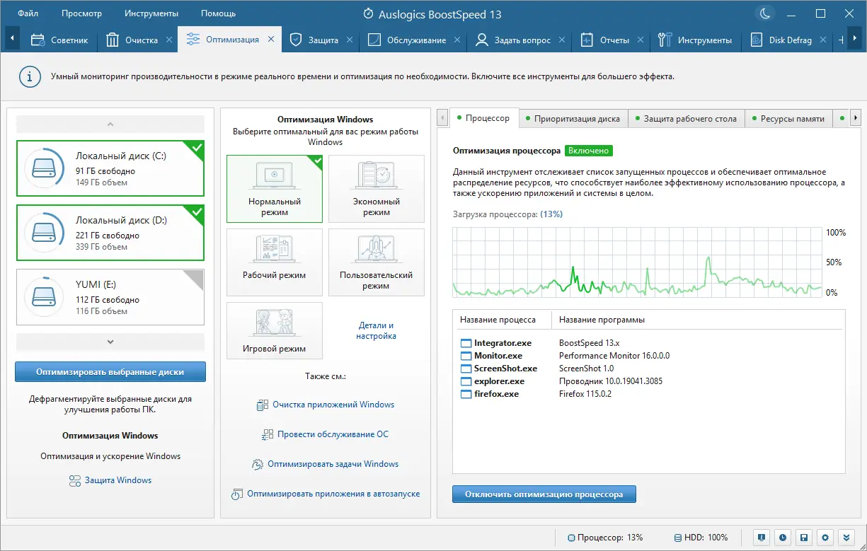 - Дефрагментация дисков и реестра для улучшения быстродействия.