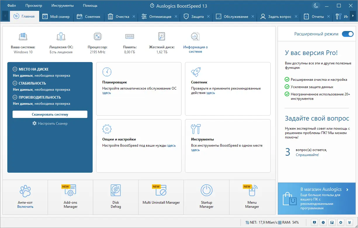 Auslogics BoostSpeed — это популярный набор инструментов, предназначенных для улучшения работы операционной системы Windows. Он позволяет выполнять комплексную оптимизацию, настройку и чистку системы, делая вашу работу на компьютере более быстрой и стабильной. В программе объединены утилиты для очистки дисков, исправления ошибок реестра, дефрагментации и контроля состояния жестких дисков, а также настройки интернет-соединения и защиты конфиденциальности. Благодаря обновленному и удобному интерфейсу, управление всеми инструментами стало ещё проще и быстрее, что делает программу востребованной как среди продвинутых пользователей, так и начинающих.