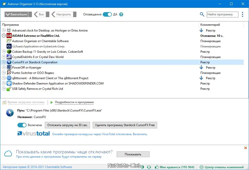 Autorun Organizer — это надежный менеджер автозагрузки, который помогает просматривать и управлять программами, автоматически запускающимися при старте системы. Инструмент предоставляет возможность проверять свойства приложений, заниматься их удалением или отложенной загрузкой, а также проверять записи на наличие угроз с помощью встроенного онлайн-антивируса Virustotal. Благодаря интуитивно понятному интерфейсу и расширенным функциям, программа идеально подходит для пользователей, желающих ускорить запуск Windows и повысить безопасность ПК.