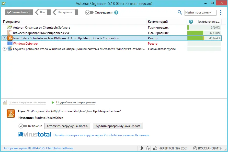Autorun Organizer — интуитивно понятное и надежное решение для контроля автозагрузки в операционных системах Windows 7, 8/8.1, 10 и 11 на платформах x32 и x64 Bit. Программа позволяет просматривать все текущие записи автозагрузки, сортировать их по времени добавления, управлять свойствами приложений и их запуском. Инструмент включает функции проверки на вирусы через онлайн-сервис Virustotal, что обеспечивает дополнительную безопасность. Также доступна возможность откладывать запуск программ, а разнообразные инструменты позволяют оптимизировать время загрузки системы.
