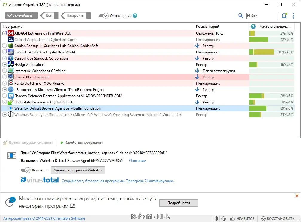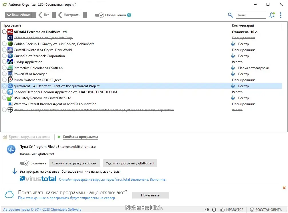Autorun Organizer — это простое в использовании решение для контроля автозагрузки, обеспечивающее безопасность и производительность вашего компьютера. Оно отображает все запущенные и запланированные программы при старте системы, сортируя их по времени добавления, что позволяет легко находить недавно установленные приложения. Встроенные функции позволяют просматривать свойства программ, проверять их на наличие вирусов с помощью онлайн-сервиса Virustotal, а также откладывать запуск приложений на некоторое время, чтобы оптимизировать скорость загрузки и снизить нагрузку на систему.