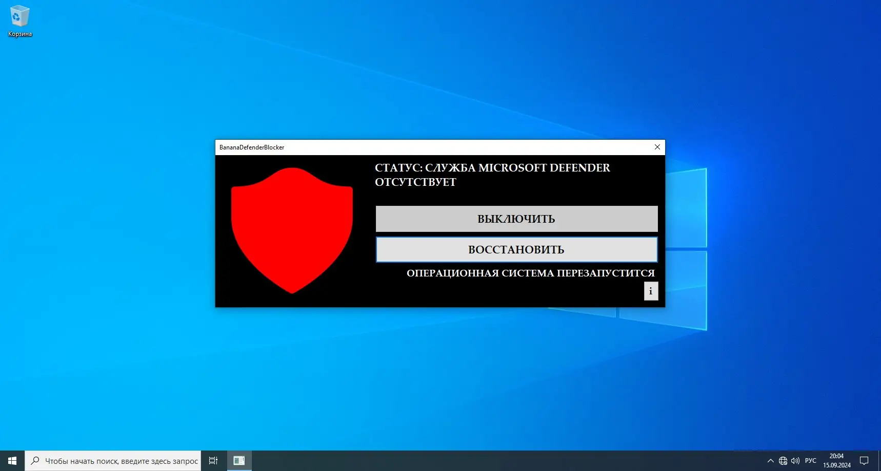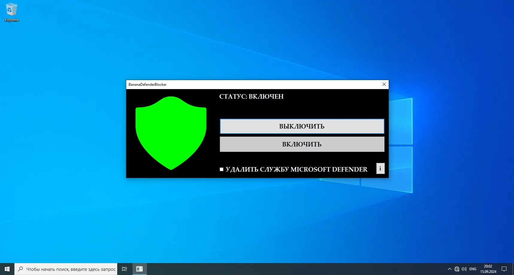- Для отключения Defender использовать ключ /Off, например, командой «BananaDefenderBlocker.exe /Off».