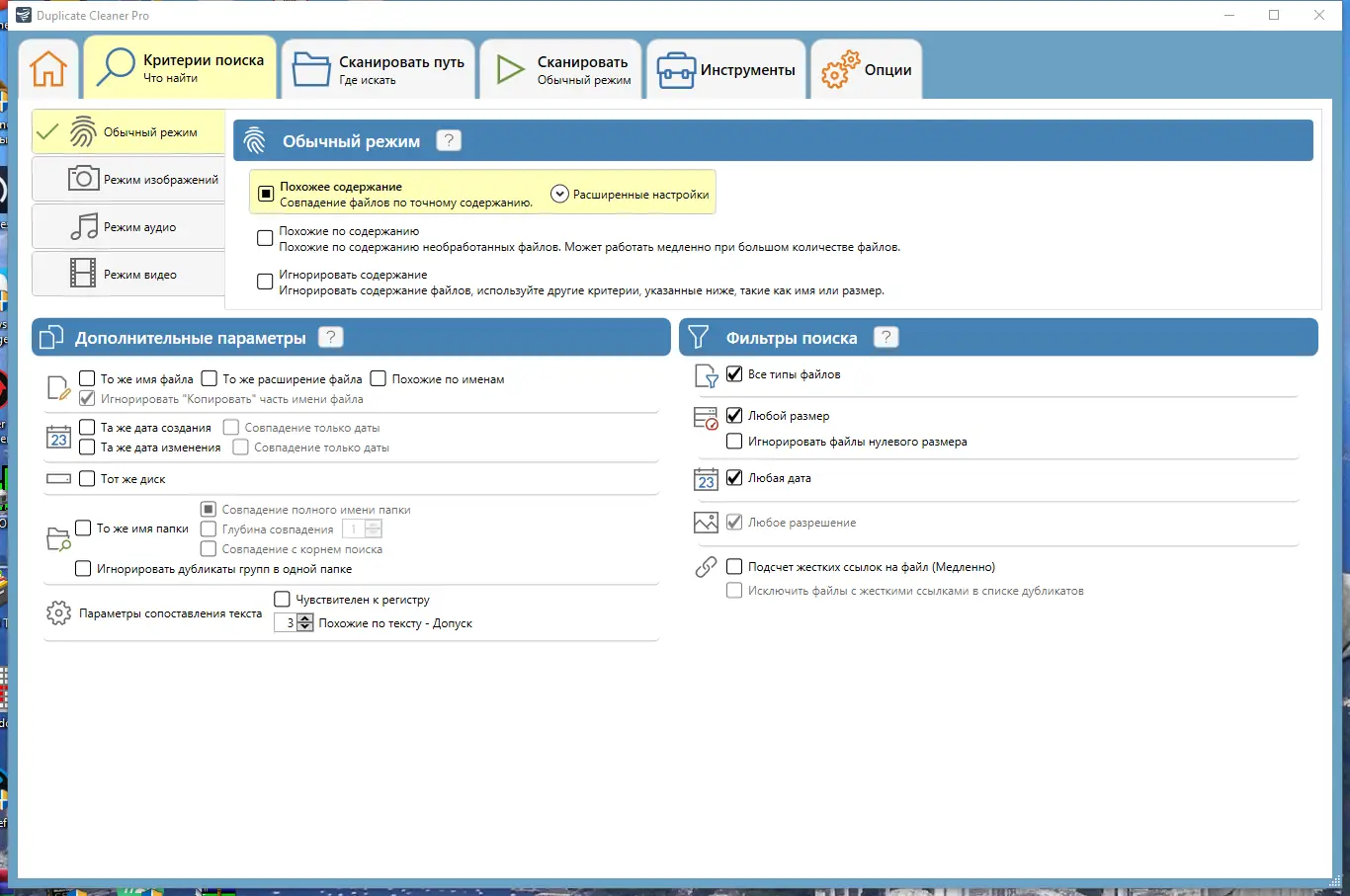 Duplicate Cleaner позволяет легко и быстро находить одинаковые и схожие файлы внутри локальных и сетевых дисков. Благодаря интуитивному интерфейсу пользователь может настроить параметры поиска по типу файла, размеру, дате создания, тегам и другим характеристикам. Особенность инструмента — возможность поиска внутри ZIP-архивов и определения похожих изображений, даже если они были отредактированы, повернуты или изменены в размере. Музыкальные файлы в популярных форматах также сканируются на предмет дубликатов по звуку и тегам. Инструмент подходит как для опытных пользователей, так и для новичков, благодаря простоте использования и расширенным функциям автоматизации.