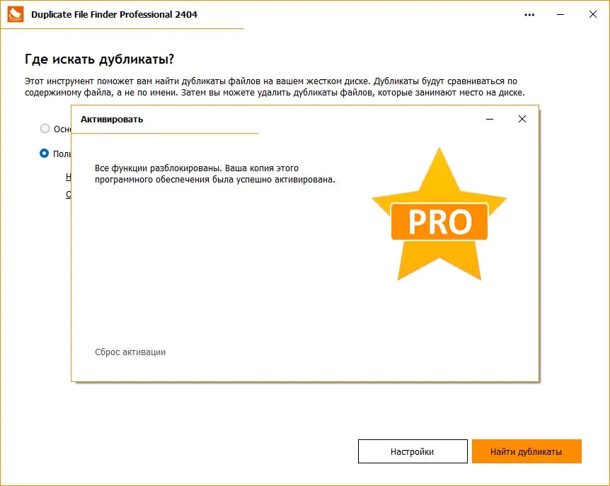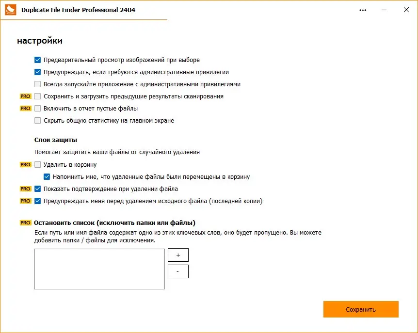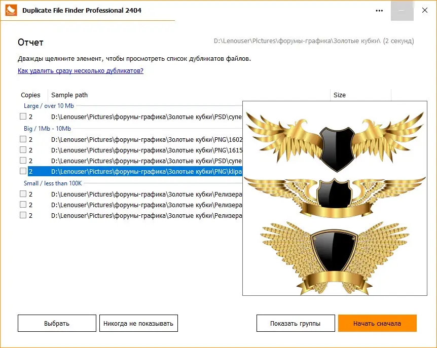 - Быстрое сканирование выбранных папок на наличие дубликатов