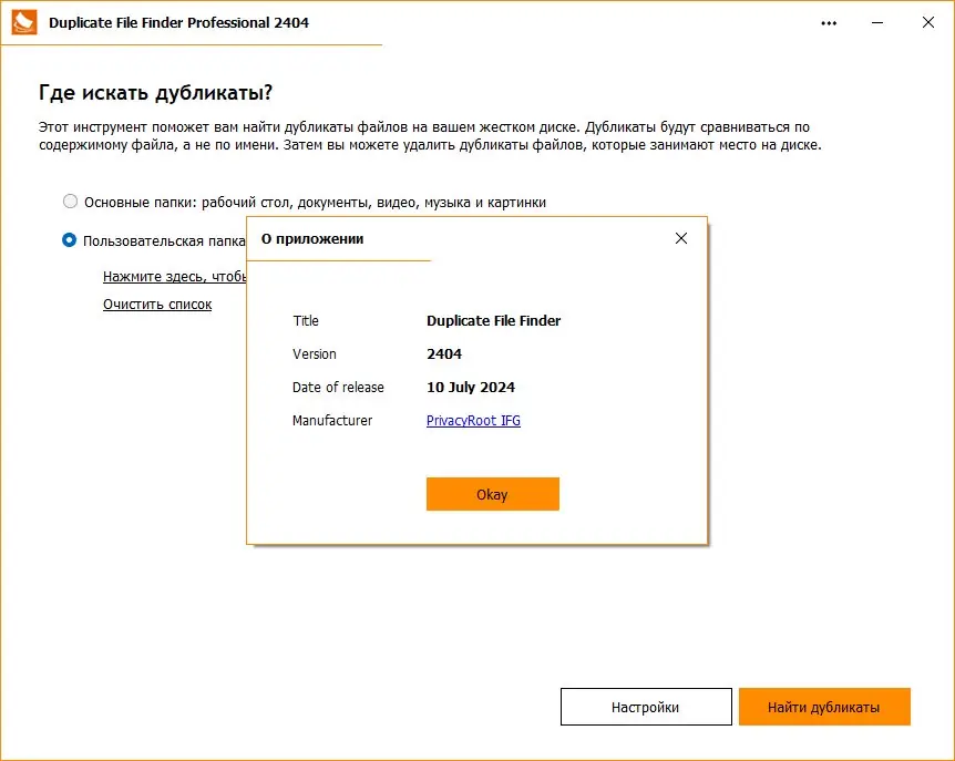 Это приложение делает то, для чего оно названо. Вы можете выбрать любую папку на жестком диске (или использовать стандартные пользовательские папки), и наше приложение глубоко проанализирует содержимое выбранных папок на наличие дубликатов. Самое удивительное, что это займет всего несколько секунд. Файлы будут сравниваться по алгоритму хэширования MD5, что означает, что они будут сравниваться по содержимому, а не по имени. Затем, используя наш удобный пользовательский интерфейс, вы можете просмотреть дубликаты и удалить те, которые вам не нужны.