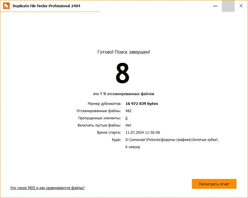 - Использование алгоритма MD5 для точного сравнения файлов по содержимому