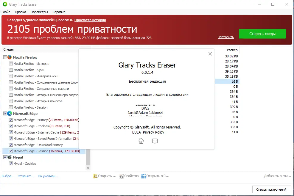 Glary Tracks Eraser — это мощный инструмент для защиты вашей конфиденциальности и чистоты системы, доступный бесплатно для всех пользователей. Программа помогает удалять следы использования Windows и браузеров, обеспечивая безопасность личных данных и ускоряя работу ПК.
