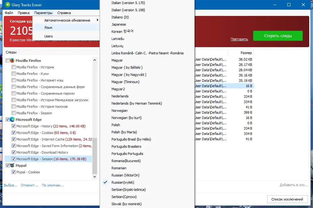 Glary Tracks Eraser предназначена для безопасного и эффективного удаления различных следов активности на вашем компьютере и в интернете. С помощью этого инструмента можно легко очистить историю просмотренных документов, временные файлы, кеш браузеров, куки, сохранённые пароли, загрузки и многое другое. Простота интерфейса и поддержка множества языков делают программу удобной как для новичков, так и для опытных пользователей.