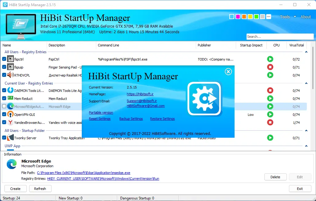 HiBit Startup Manager — это мощная утилита для управления автозагрузкой и оптимизации работы системы Windows. Она помогает пользователям контролировать запущенные приложения, повышая производительность и безопасность системы.