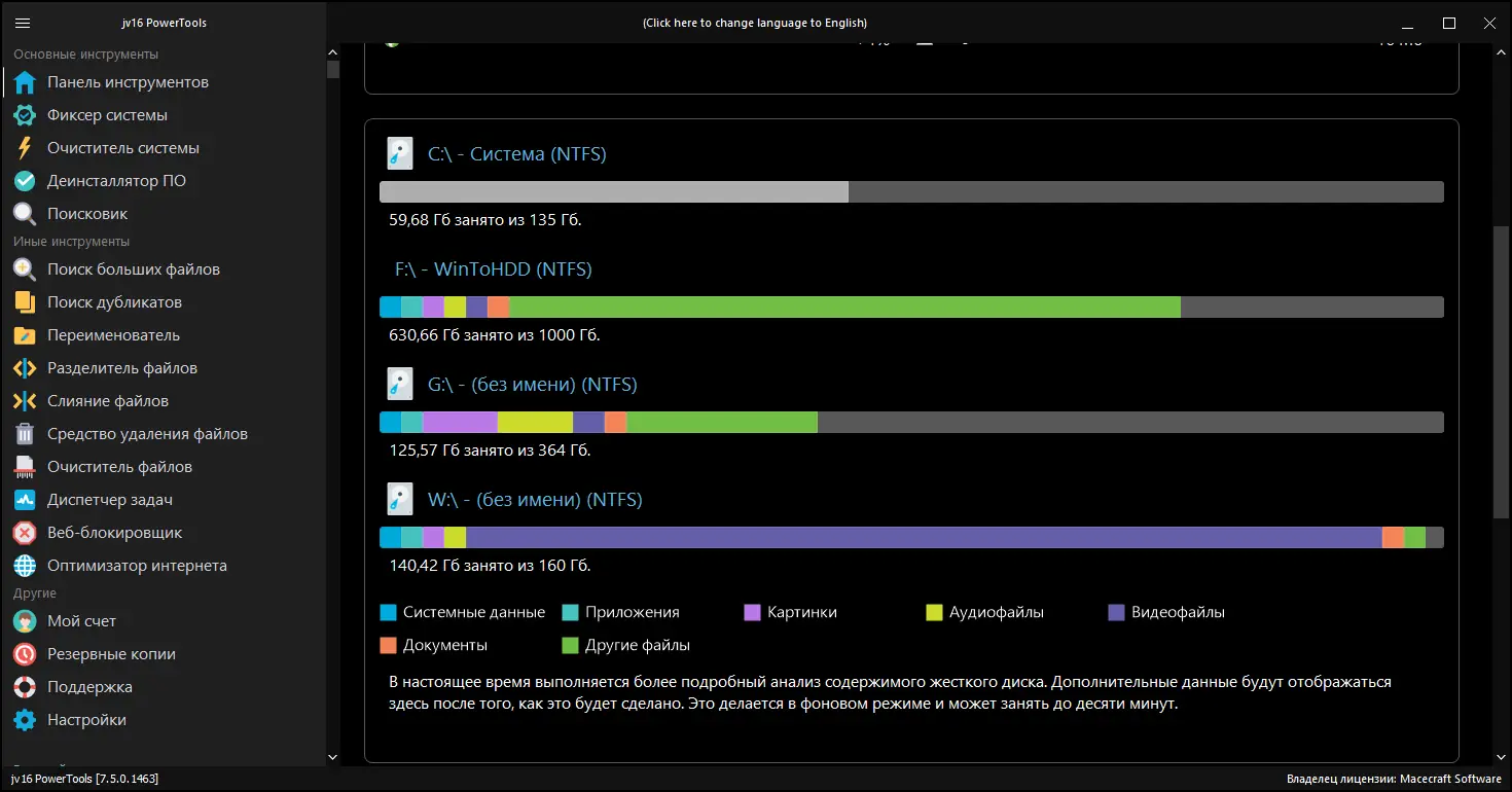 jv16 PowerTools — это достаточно мощный набор утилит, позволяющий наблюдать, очищать и контролировать системный реестр, файловую систему и локальную сеть. Одна из главных особенностей — объединение 24 различных компонентов, каждый из которых предназначен для выполнения конкретных задач. Интерфейс программы разбит на вкладки, что облегчает работу и повышает эффективность обслуживания системы. Вся функциональность включает как автоматические, так и ручные инструменты для очистки, поиска, редактирования и управления файлами, реестром и системными настройками.