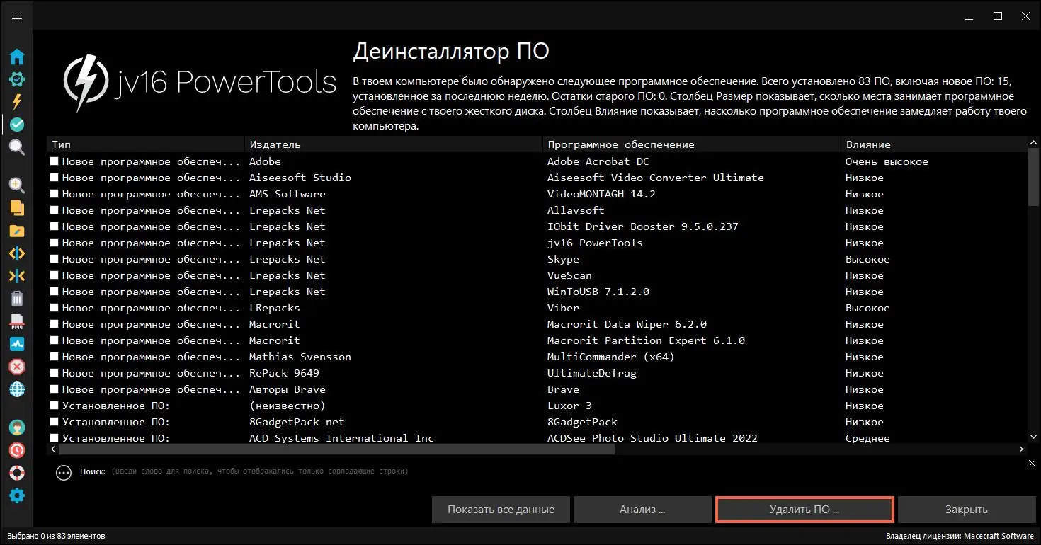 jv16 PowerTools — достаточно мощный набор утилит, позволяющий наблюдать, очищать и контролировать системный реестр, файловую систему и локальную сеть. Включая 24 компонента с разной функциональностью, программа обеспечивает комплексную поддержку для оптимизации работы ПК. Интерфейс разбит на вкладки, что позволяет удобно управлять реестром, файлами и системой в целом. Вы сможете просматривать, искать, редактировать и сжимать реестр, а также выполнять очистку дисков и управление автозагрузкой, что повышает стабильность и скорость работы системы.