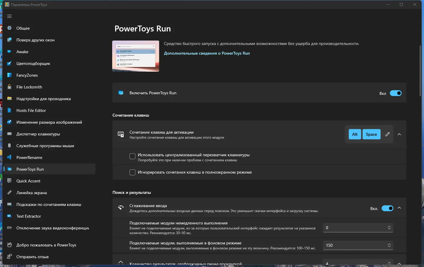 - Панель PowerToys — быстрый запуск приложений по имени или файлу, вызываемый сочетанием Alt + пробел.